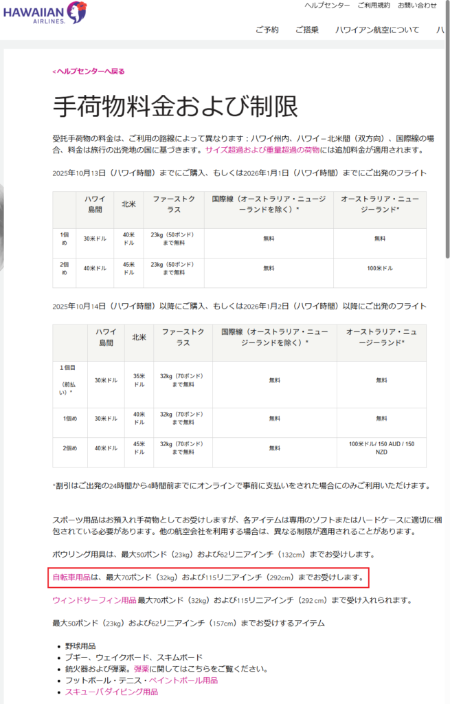 2025年1月に確認した時は、自転車用品も 50ポンド(約22.6kg)を超える場合には往路復路ともに追加料金がかかる(日本発 片道15,000円、ハワイ発 片道 150USD) と記載があったのですが、70ポンド(約32kg)までは追加料金がかからないように規定が変わったようです。